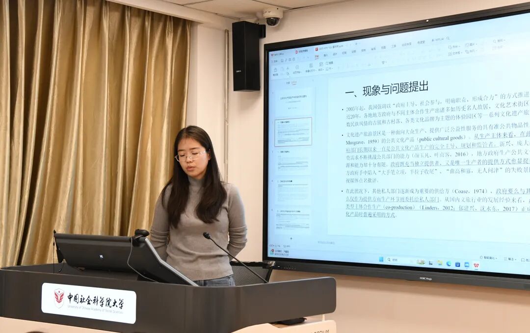雷天娇同学在《公共文化产品生产中的组织形式建构——以K区地坑院景区开发为例》一文中,呈现了研创项目的阶段性研究成果,以K区打造地坑院文化遗产旅游景区的历程为案例,聚焦地方政府与其他主体合作生产公共文化产品的行动策略,探析合作生产行动中地方政府对合作生产组织的建构和调整,如何影响了合作生产效果。文章最终回到了政府行为角度探讨这一组织形态变化的过程,从合作主体间关系和地点吸引力竞争两方面作出解释。王晶老师认为,对于文章中所提出的概念和后续政府行为角度出发的解释逻辑,应当更紧密地与组织理论相联系,加强理论部分的逻辑统一性并明确出研究贡献。沈杰老师指出,文章的题目可以再做推敲,尽量能够清晰表意核心论点。赵联飞老师认为,该研究具备较丰富的社会学想象力,在选题角度、研究规范和案例研究方面均有较大的研究潜力和价值,鼓励研究者接续深入,细致调整。