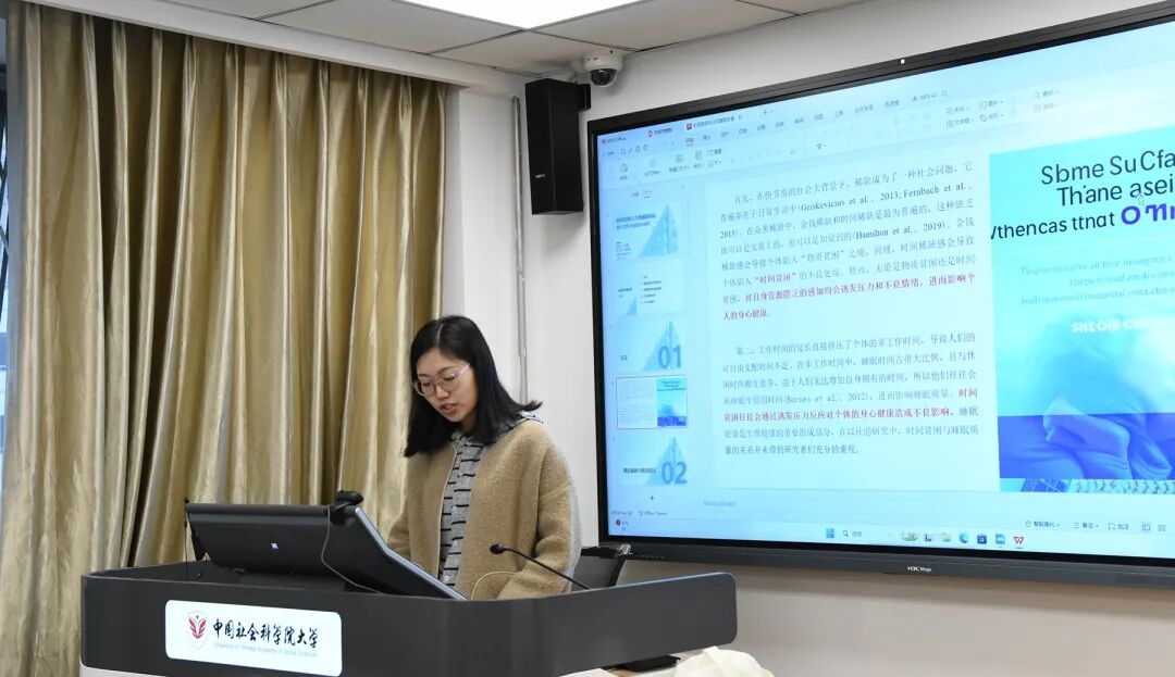 刘娜同学及其项目组成员在《时间贫困与主观睡眠质量:基于应激过程模型的解释》中,立足于应激过程模型,探讨中国成年人的时间贫困(时间强度大)对主观睡眠质量的影响及其生理-心理机制,重点分析认知评价、自评健康状况及心理健康(抑郁/焦虑)的中介作用。实证结果证实了时间贫困不仅可以直接导致睡眠质量差,还可以通过认知评价、自评健康状况或心理健康状况(焦虑/抑郁)的独立中介/链式中介间接影响睡眠质量。该研究为个体时间管理干预及组织健康政策制定提供了理论依据。沈杰老师认为,对主观睡眠质量的影响因素探讨,要考虑到譬如人格特质等其他个体特征的影响;此外,还要提升本研究的理论高度和现实意义。赵联飞老师认为,可以将抑郁和焦虑合并做心理健康,这样在结构方程模型中可以更方便解释,也更能呼应本研究提及的生理-心理机制。