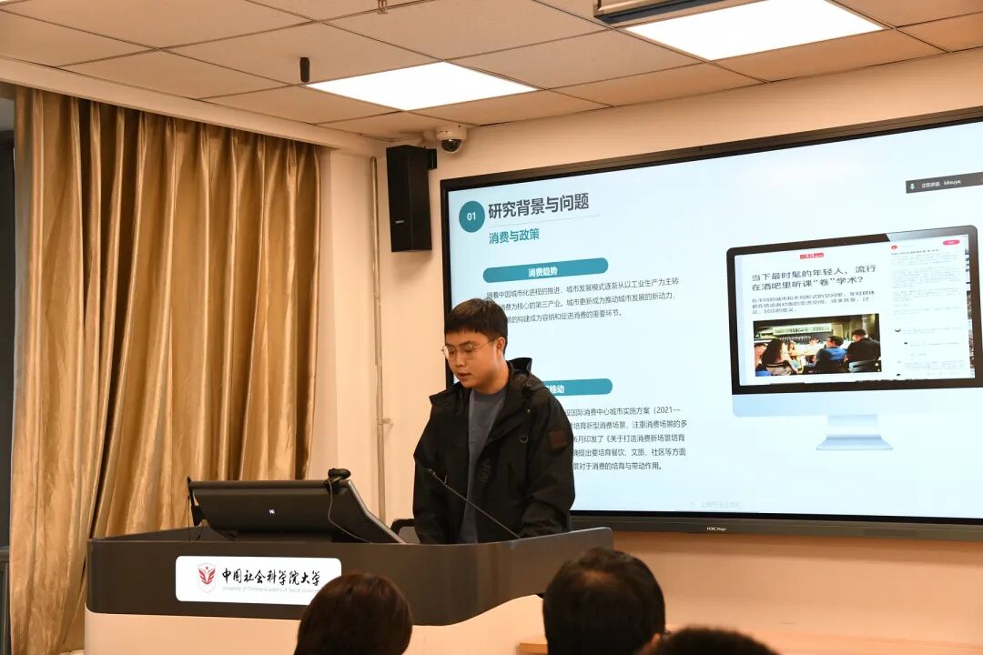 姚茗元同学及其项目组成员在《消费场景如何培育消费新动能:以北京市演艺与文化街区为例》中以北京市的典型历史文化街区与消费场景为例,着重分析了当前消费场景构建在促进消费中的重要作用。项目组在回顾相关文献的基础上,构建了消费场景的不同理想类型,并将其与供给侧的组织结构进行整合分析,最终通过扎根方式发现消费场景的相关运行逻辑。沈杰老师认为,该研究的空间概念可以进一步澄清,对其研究脉络回顾可以参考“景观社会”的相关概念;王晶老师认为,该项目可以聚焦某一类型的场景和运行机制,将研究做深做细;赵联飞老师指出“场景“概念可以参考计算机领域的”应用场景“,进一步明确概念内涵。