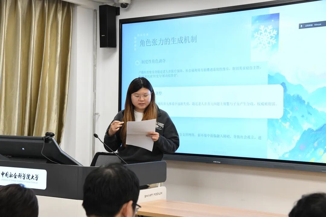 李雪惠同学及其项目成员的项目是《代际整合中的角色张力:随迁老人城市适应机制的社会学研究》。她从一位老人因医保报销困境而忍受牙痛的案例入手,揭示了随迁老人同时承担”照料者”“依附者”与”外来者”三重身份所产生的角色张力。研究通过对28户随迁老人家庭长达五个月的追踪观察,提出”角色张力弹性”概念,识别出”选择性妥协”“情感补偿”和”数字赋权”三种典型的协商策略,并发现”劳动密集但权力稀薄”的悖论现象。A老师和C老师均提出应更明确界定”随迁老人”这一核心概念,包括其年龄范围、迁移动机、居住时长等维度的操作化标准,以及与”流动老人”“候鸟老人”等相关概念的区别与联系。B老师指出,研究应更深入地辨析”城市适应”与”社会融入”两个概念在理论内涵和实践层面的差异,并探讨两者之间的转化机制及影响因素。