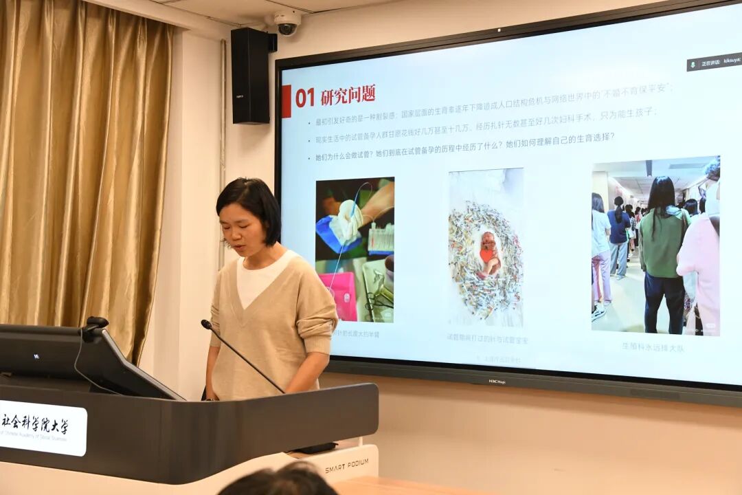 唐姝琦同学在题为《情感、责任与主体性:从辅助生殖技术应用看中国现代化背景下的女性生育叙事》的汇报中关注了辅助生殖技术背景下中国女性的复杂生育叙事,将辅助生殖技术视为一个独特的生命历程,强调女性在其中经历的反思与行动。面对技术的不确定性与“女性全责”的生育叙事,试管女性并非被动承受者。她们通过互联网进行“知识充权”、主动管理情绪、协商家庭关系,并在医学、家庭与性别规范的多重张力中积极构建自身的主体性。王晶老师认为,在已有材料的基础上,可以更加关注试管备孕女性在女性主义话语和现实家庭生活实践之间面对的张力,并呈现出其中冲突和协商的细节。