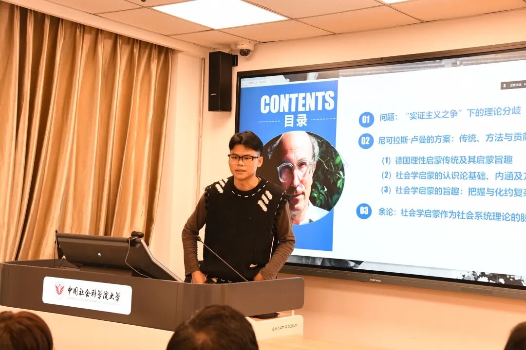周忠贤同学及其项目成员在阶段性成果《作为社会学启蒙的系统理论:内涵及方法——以卢曼1967年就职演讲<社会学启蒙>为中心线索》一文中,通过梳理德国社会学加尼克拉斯·卢曼的社会系统理论中的“社会学启蒙方案”,特别是卢曼1967年就职演讲“社会学启蒙”中的基本观点与卢曼后期的社会理论建构的关联,呈现了卢曼以“社会学启蒙”为线索的社会理论建构的旨趣。文章梳理了德国社会学中实证主义之争下,卢曼与哈贝马斯对德国社会科学重建的理论思考,以哈贝马斯的沟通行动理论为潜在的理论对话,展示了卢曼以系统/环境取代整体/部分的系统理论范式转变,同时文章系统呈现了社会学启蒙方案的基本维度:非一致性视角、潜在功能的关注、从要素论到系统论、功能分析。最后,文章试图以“社会学启蒙”作为理解卢曼复杂的社会系统理论的脉络。沈杰老师认为,卢曼的社会系统理论以“复杂性”为线索,其系统理论旨在把握功能分化社会中的复杂性问题。因此,以社会学启蒙为线索呈现社会系统理论的脉络,需要论证这样做的创新性。同时,文章需要更多地综合相关的二手文献,从而形成必要的理论对话。