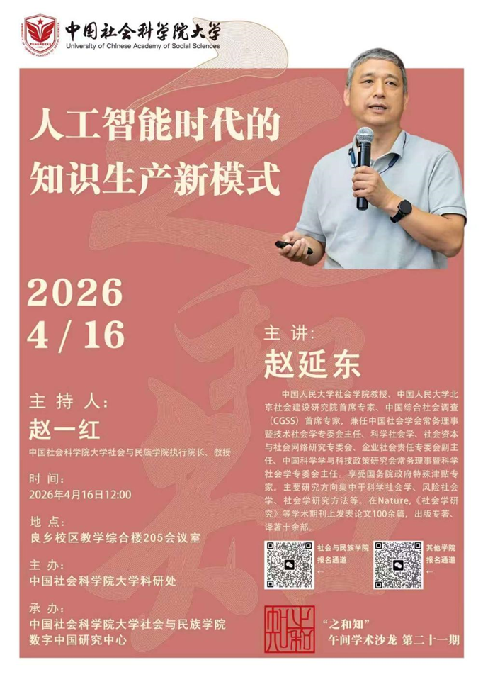中国社会科学院大学“之和知”午间学术沙龙第二十一讲于2026年4月16日中午在良乡校区教学综合楼205会议室顺利举行。本次活动由中国社会科学院大学科研处主办,社会与民族学院数字中国研究中心承办。活动邀请到中国人民大学社会学院教授、中国人民大学北京社会建设研究院首席专家、中国综合社会调查(CGSS)首席专家赵延东教授担任主讲嘉宾,以“人工智能时代的知识生产新模式”为题开展专题讲座。赵延东教授在讲座中系统梳理了知识生产范式的历史演进,深入剖析了人工智能驱动科学研究带来的机遇与挑战,并结合团队最新实证调查数据,探讨了AI对我国科学研究与科研工作者职业前景的深远影响。中国社会科学院大学社会与民族学院执行院长赵一红教授主持本次沙龙,全校五十余名师生到场参与交流。