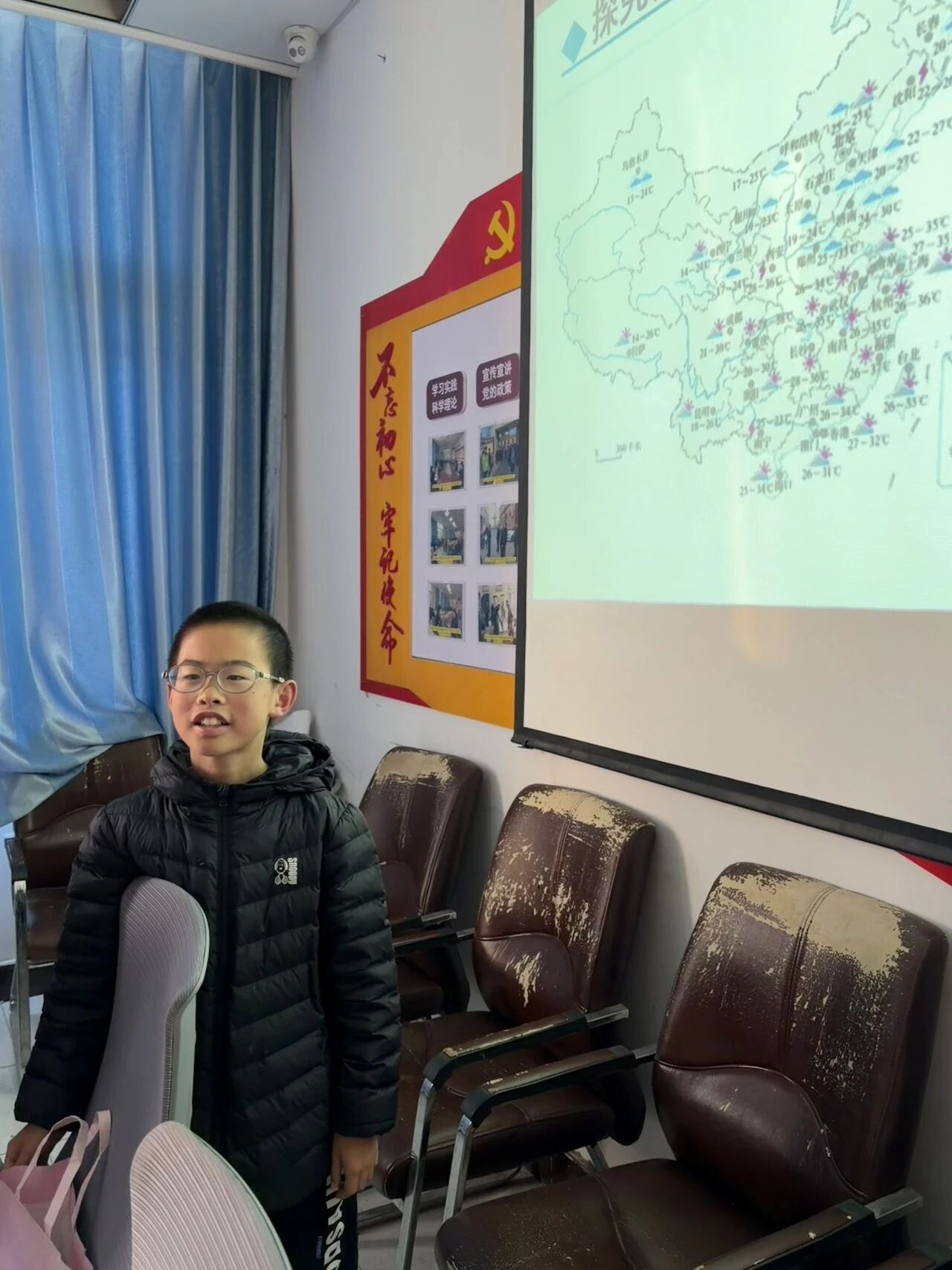 在天气预报实践环节,孩子们化身“小小天气播报员”,认真学习风向杆、风羽等气象符号的含义,掌握了风力与风向的识别方法。面对模拟的全国天气预报地图,孩子们踊跃举手,清晰播报不同城市的气温、天气状况,不仅熟练运用了所学知识,更锻炼了语言组织与公开表达能力。互动问答中,大家围绕天气相关问题积极思考、大胆发言,现场氛围热烈而有序。