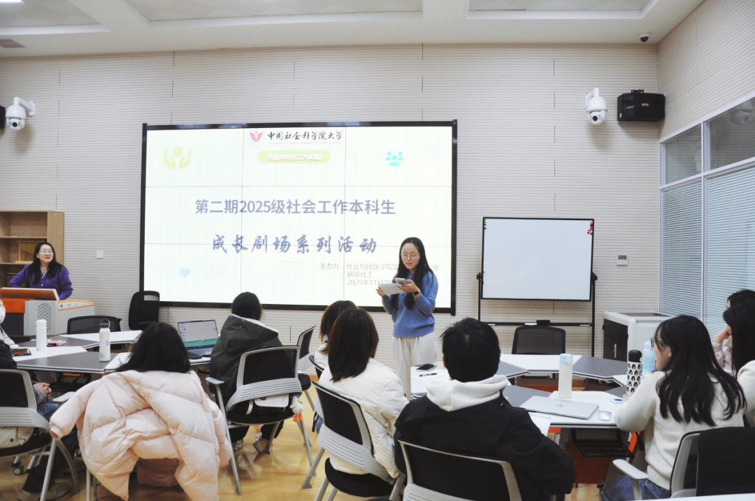 为帮助2025级社会工作本科新生了解社会工作的实务工作与专业价值,增强同学们的专业认同感。2025年11月7日下午,中国社会科学院大学社会与民族学院第二期“2025级社会工作本科生成长剧场系列活动”在社工实验室顺利开展。本次活动由社会与民族学院实习实践办公室主任郑玲老师主持,25级研苑社工编辑部的硕士师姐们协助。本次活动通过观影、互动答题与小组讨论的形式,助力新生在专业认知与价值塑造上实现初步成长。