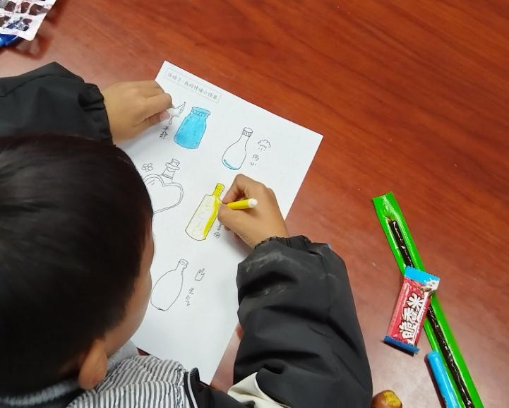 最后,社工引导孩子们用色彩和图画梳理自己的情绪。孩子们兴奋地挑选代表不同情绪的颜色,有的孩子用明亮的黄色涂抹“开心”瓶,用深蓝色描绘“难过”瓶,用红色绘画 “生气”瓶。有的孩子在“美好”瓶里画上许多小爱心,有的孩子在“伤心”瓶里画出代表难过的小雨滴,还有的孩子把“开心”瓶上涂得满满当当,表达自己非常开心。这个环节让孩子们在创作过程中学会识别和表达自己的情绪,通过视觉化的方式将内心感受具象化。