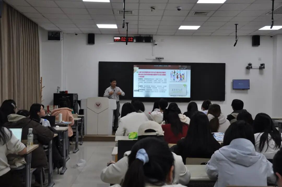 卢老师长期聚焦基层治理与公益慈善研究,兼具扎实理论功底与丰富实务经验。讲座中,他结合行业观察与自身实践经历,重点阐述了两大核心关注方向:一方面,在当前经济发展承压、财政资金压缩的背景下,社工行业回归社会性迎来重要机遇,而公益慈善领域的海量资源仍有待进一步激活,二者的深度融合将为基层服务注入新动能;另一方面,中国式社区治理现代化是行业核心命题,社区作为社会问题与民生服务需求的集中场域,面临着诸多亟待破解的治理难题。卢老师抛出“你期待的美好社区是什么样的”引发同学们思考,有同学表示希望自己所在社区环境干净整洁、生活便利快捷、设施配套完备、居住安全无忧、邻里关系和谐、文化活动丰富、社区充满温度、困难群体得到尊严保障、居民拥有充足互动空间。卢老师指出当前社区治理的突出困境:基层组织行政事务繁杂、人力薄弱且权责不对等,常陷入力不从心的状态;居民参与感不足、邻里互动匮乏,社区共同体意识亟待培育。卢老师强调,社区治理已成为国家发展战略,近年国家也出台了城乡社区协商、加强基层治理体系和治理能力现代化等多项顶层制度设计文件,为基层治理提供了坚实保障。而破局的关键在于动员多元主体参与,明确社区居委会作为基层枢纽型组织的定位,提升整体治理效能。