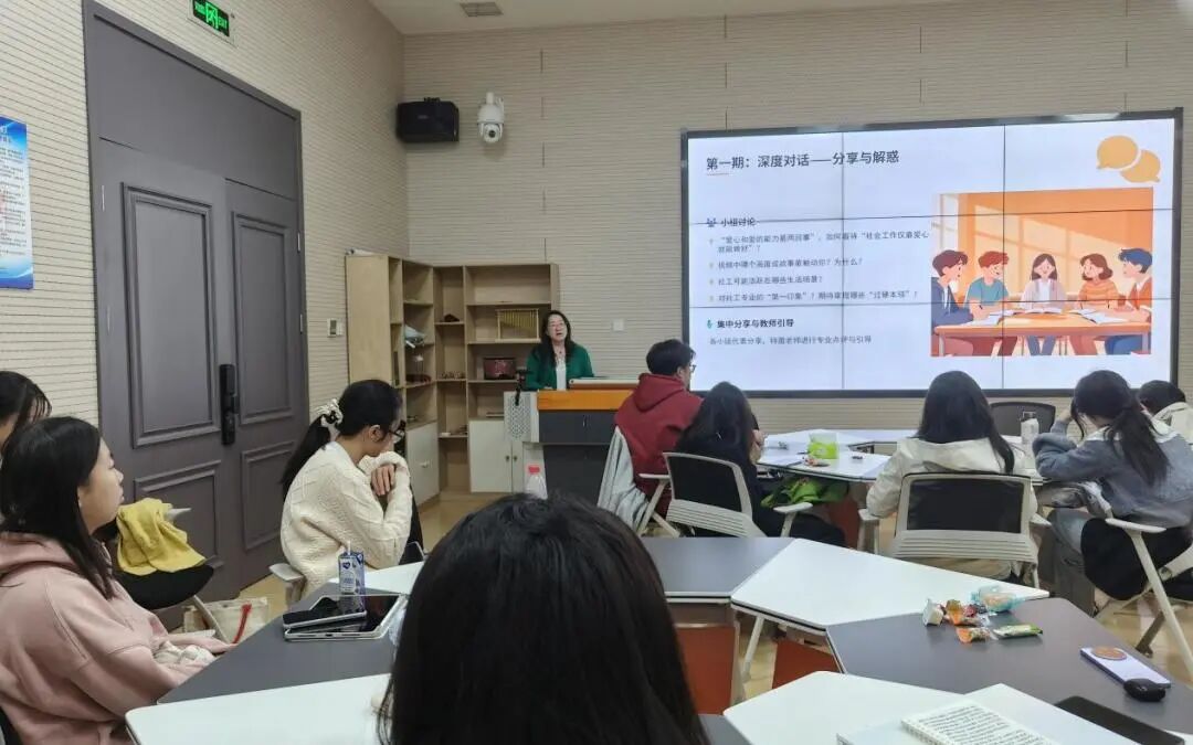 在主题观影环节,师生共同观看了社会工作纪录片《社工情》和《救助困境群体的社会工作者》。《社工情》展现了北京汽南社区从“三多社区”到文明社区的蜕变历程。影片中,王世良会长坚持八年自费制作信箱为居民送信,殷金凤书记为改造下水道日日蹲守领导等真实故事,让新生看到了基层社工的主动担当与坚持不懈。而《救助困境群体的社会工作者》则聚焦北京市协作者社会工作发展中心的生动实践,如协作者四季青童缘为小燕等新就业群体子女提供课业辅导,小燕母亲从协作者的受助者成长为志愿者,向同学们生动诠释了社会工作助人自助的价值理念。